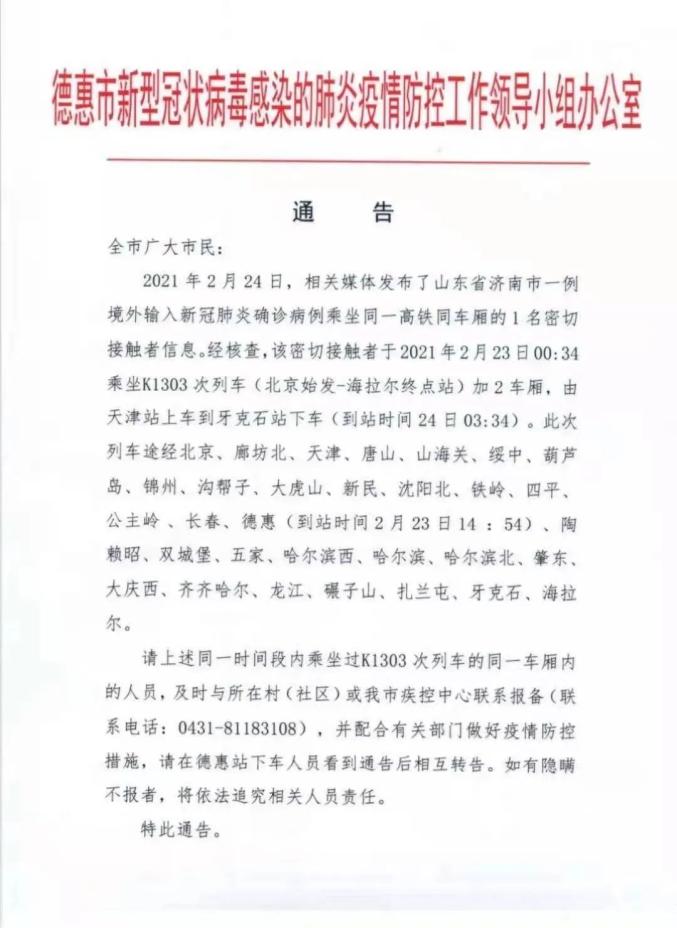 根据通告,近日相关媒体发布了山东省济南市一例境外输入新冠肺炎确诊病例乘坐同一高铁同车厢的1名密切接触者信息。经核查,该密切接触者于2月23日00:34乘坐K1303次列车(北京始发-海拉尔终点站)加2车厢,由天津站上车到牙克石站下车(到站时间24日03:34)。此次列车途经北京、廊坊北、天津、唐山、山海关、绥中、葫芦岛、锦州、沟帮子、大虎山、新民、沈阳北、铁岭、四平、公主岭(2月23日13:01到站)、长春、德惠、陶赖昭、双城堡、五家、哈尔滨西、哈尔滨、哈尔滨北、肇东、大庆西、齐齐哈尔、龙江、碾子山、扎兰屯、牙克石、海拉尔。