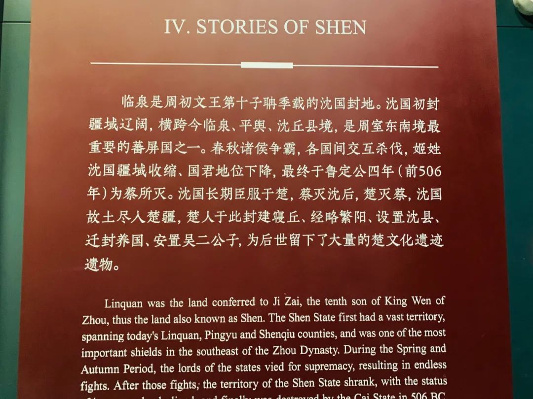 基本陈列展览选取内容的时间跨度,上限起于新石器时代,下限止于临泉建县(1935年),按年代先后分为“序厅”、“文明摇篮”、“鲖水金道”、“姜尚故里”、“沈风楚韵”、“汉晋华章”、“千年沈丘”、“民国风云”、“专题陈列展”八个板块的基本陈列。