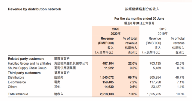 集团截至2019年12月31日止年度向关联方(主指向海底捞集团销售)销售的销售收入为16.63亿元,同比增长41.4%,关联方销售收入占集团总销售收入的38.83%。