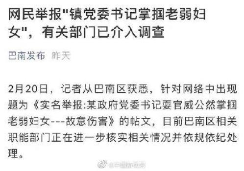 30.重庆一网民实名举报被镇党委书记掌掴,官方介入调查:日前,有网民发帖称,2020年7月重庆农妇高某英等一行四人到重庆市巴南区东温泉镇政府解决因强拆致婆婆生病问题,遭镇党委书记刘某杰掌掴后抢夺手机。22日,据巴南区委宣传部消息,目前该区相关职能部门正在进一步核实相关情况并依规依纪处理。(中国新闻网)