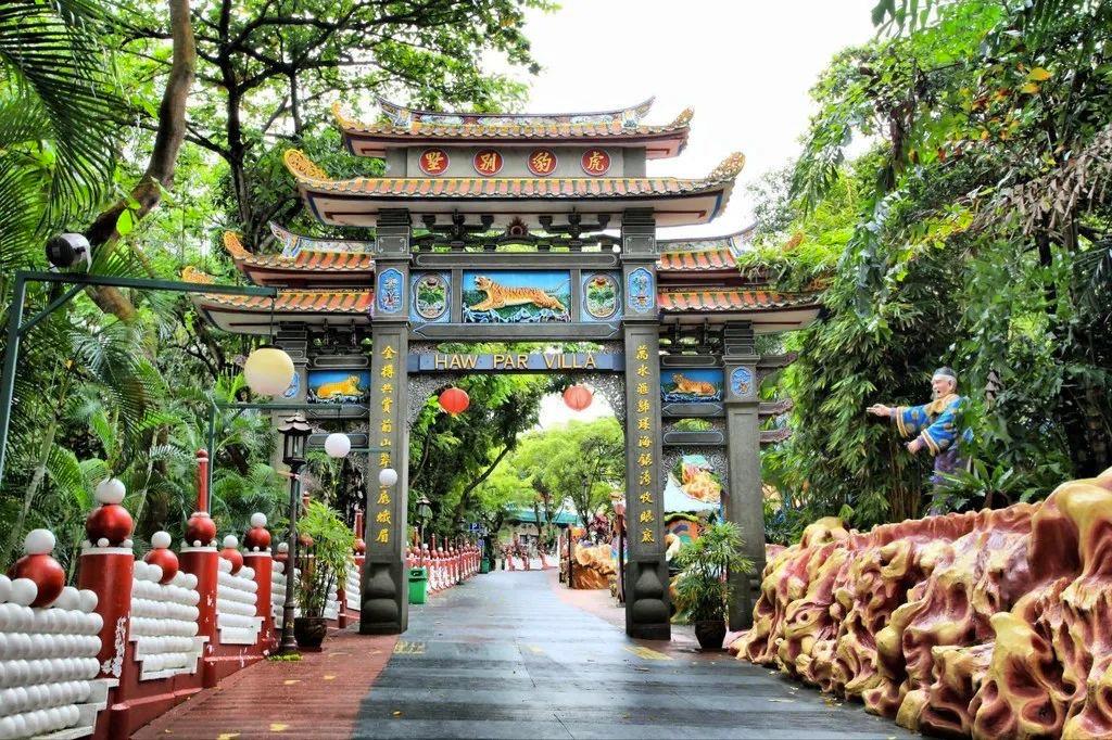 虎豹别墅始建于1937年,坐落于新加坡西海岸巴丝班让路临海的山岗上。是华侨胡文虎和胡文豹兄弟在南洋开药厂、卖万金油、八卦丹、清快水和虎油等,发了大财后耗资千万所兴建的当地占地面积最大的私人花园(约32万平方)。光从掩映在树木之中的大门,看不出任何端倪,给人的第一印象无非就是一座普通的公园。