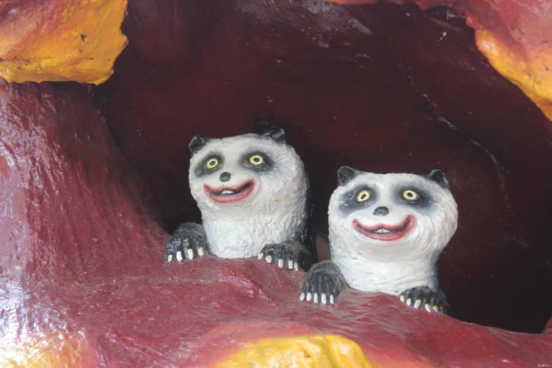 往里走,遇到两只趴在洞口直勾勾盯着你微笑的熊猫之后,你开始怀疑宫崎骏创作《千与千寻》的时候是不是来这里采过风。