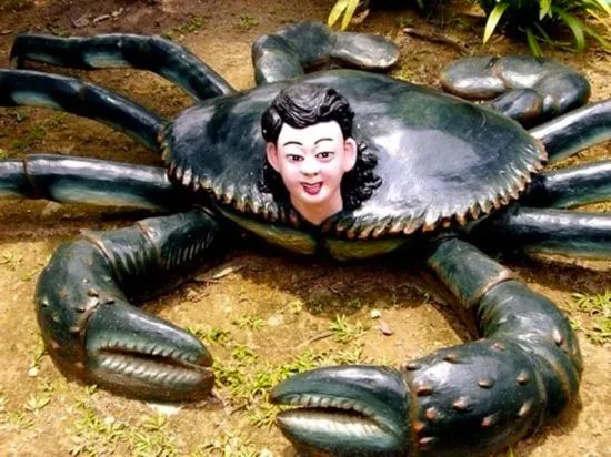 一只螃蟹趴在地上,上面还长着一颗人脑袋,不敢相信这是来自上世纪上半叶的奇思妙想。一位来自香港的游客说他从此之后再也不敢吃螃蟹,看到螃蟹就会想到虎标万金油乐园里这只向他招手的螃蟹人。