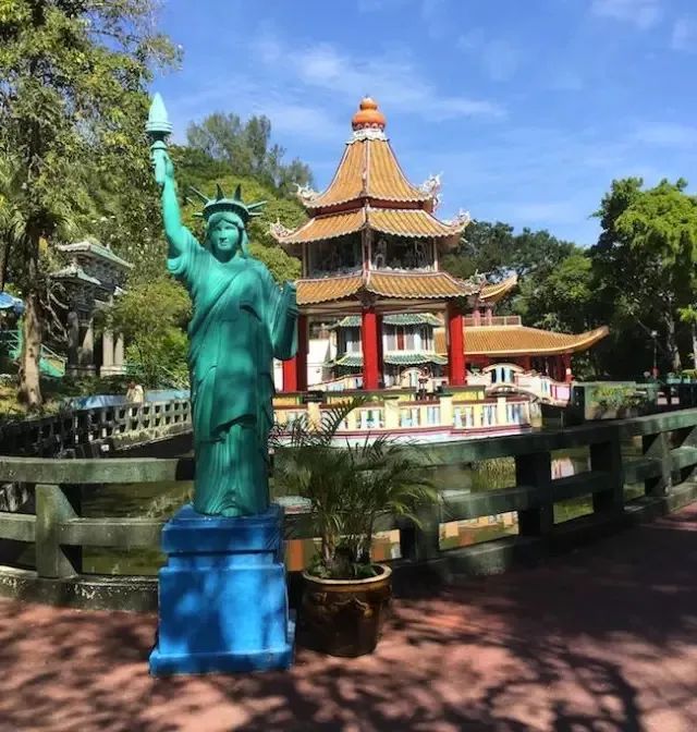 据说这里面总共有1000多座雕像,主要依据中国古代神话传说和儒家思想建成,那自然少不了各路神仙。不仅把观世音菩萨和潮州灵山佛祖请了过来,就连纽约的自由女神像也在乐园里占有一席之地,东西方文化的融合碰撞,原来早在万金油乐园里实现了。
