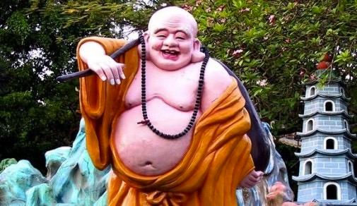 西游记群雕中的唐三藏,被两个只穿肚兜的女子拦路劫色。依然双手合十,目光坚定地望向远方。