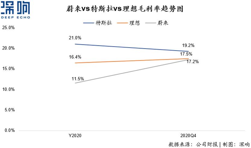 国内最早实现盈利的新造车企业理想,其2020年四季度毛利率则为17.5%,全年毛利率为16.4%,也已经处于较为稳定状态。