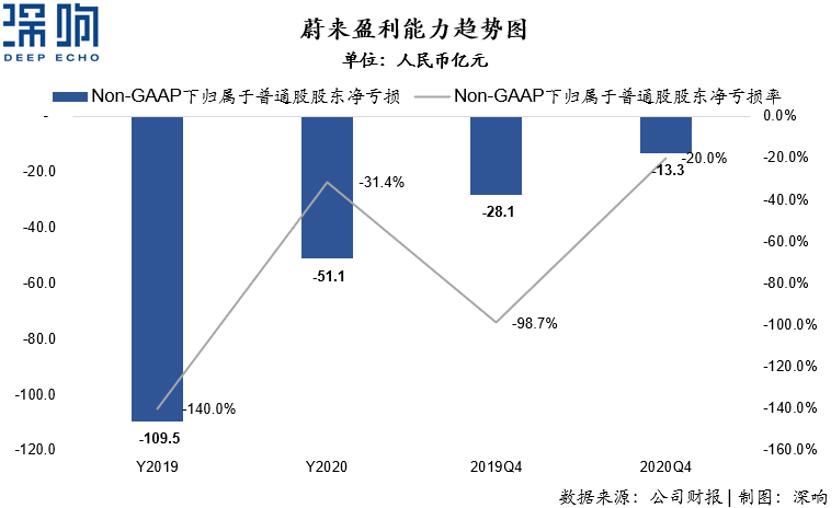 四季度,蔚来Non-GAAP下归属于普通股股东净亏损为13.3亿元人民币,亏损率为-20%,而去年同期则为亏损28.1亿元,减亏率达到一半以上。