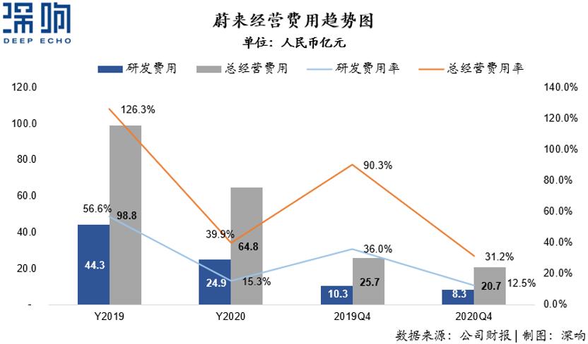 蔚来在2020年全年经营费用64.8亿元,较2019年同比下降34.4%。其中全年投入研发费用则从2019年的44.3亿下降到2020年的24.9亿元,降幅高达43.8%。
