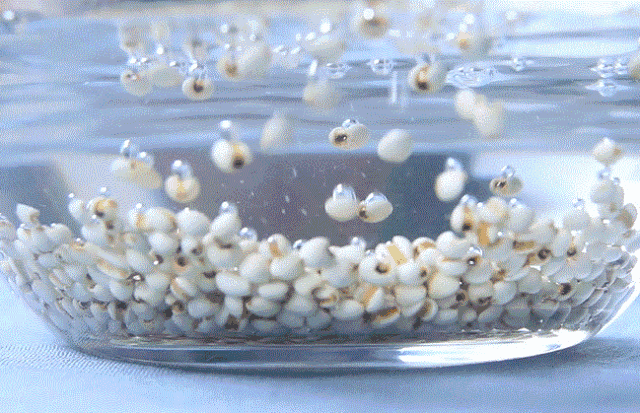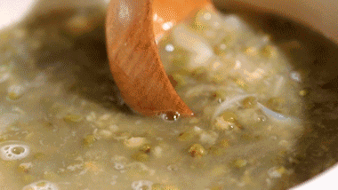 方法二:在粥煮开了后,往粥内加入凉水,绿豆受到了冷水的刺激后,就很容易开花,能够快速被煮开~