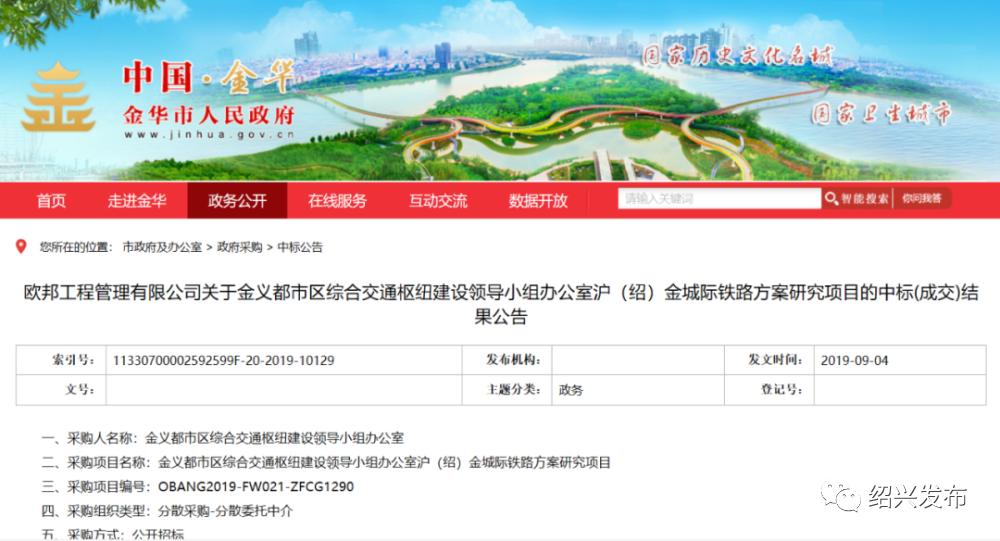 沪绍金城际铁路2019年,金华市发布《沪绍金城际铁路方案研究项目中标公示》▼▼▼