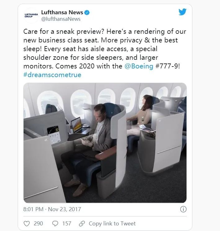 汉莎航空还计划在2022年推出新的商务舱产品,提供更大的空间和隐私,采用1-1-1和1-2-1交替配置。值得一提的是,这个新的商务舱产品汉莎航空早在2017年11月就在社交媒体上炫耀过了。