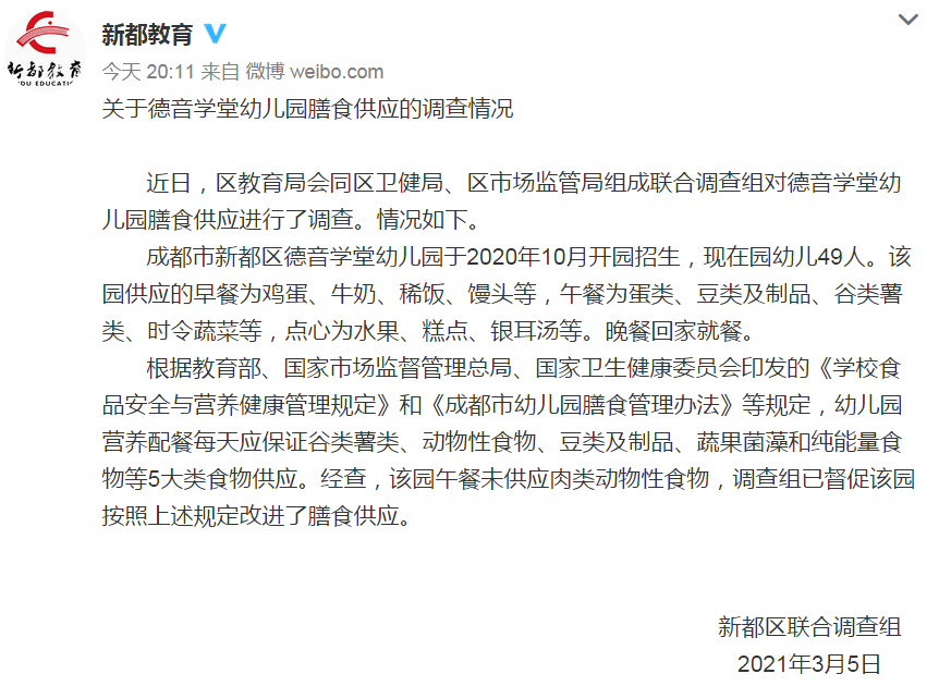 成都市新都区教育局3月5日晚发布《关于德音学堂幼儿园膳食供应的调查情况》 截图