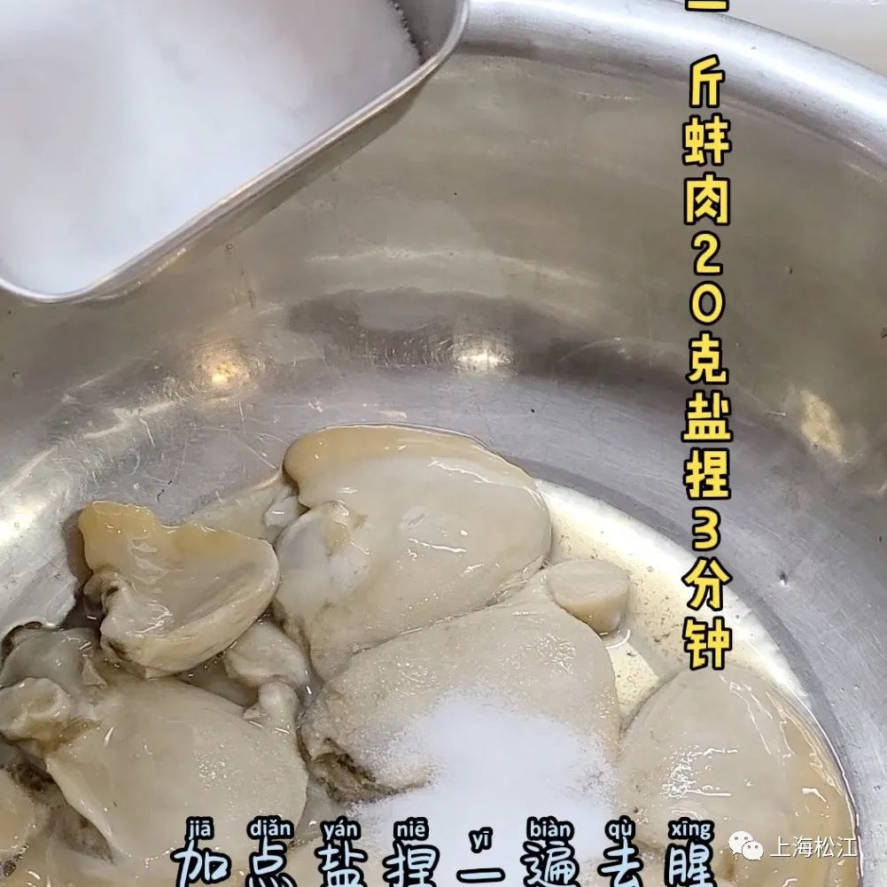 2. 200克蚌肉加8克盐,捏3分钟去腥,再用清水洗净;