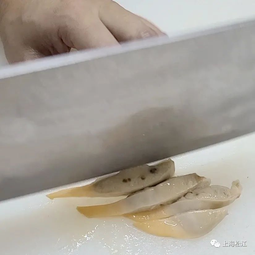河蚌改刀厚度控制在1厘米以内,便于快速熟透,可以用少量油直接滑熟,更为鲜嫩。