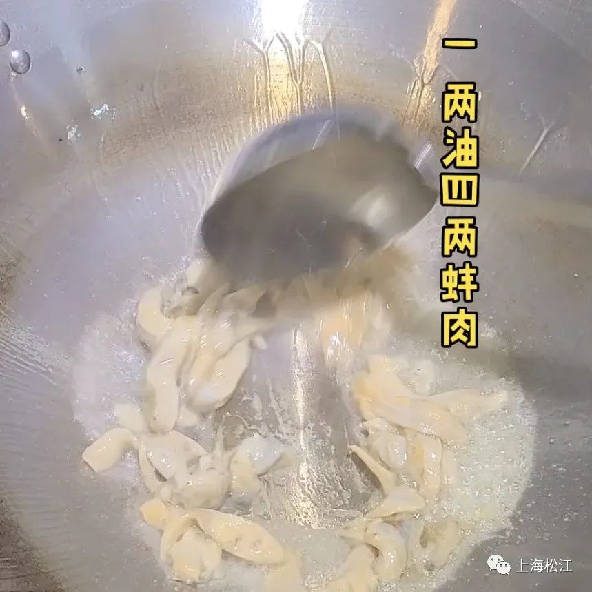7. 锅烧热加油,将蚌肉炒熟备用,200克蚌肉需要用50克油;