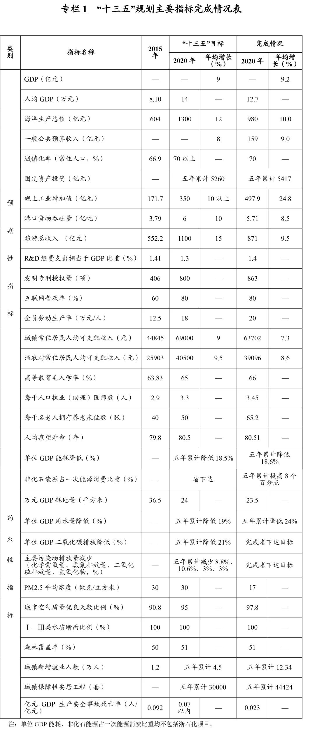 一是综合实力迈上新台阶。“十三五”期间GDP年均增长9.2%,增速居全省首位。到2020年底,人均GDP(按常住人口计算)12.7万元。一般公共预算收入达到159亿元。进出口总额1667亿元,其中出口总额588亿元。海洋生产总值占GDP比重达65%以上。舟山港域港口货物吞吐量达到5.71亿吨。国内首屈一指的鱼山石化基地一期全面投产,波音完工和交付中心项目顺利完成;港口航运、远洋渔业、船舶装备、滨海旅游等特色优势产业稳固增长,智慧海洋、海洋新能源等新兴产业取得突破。