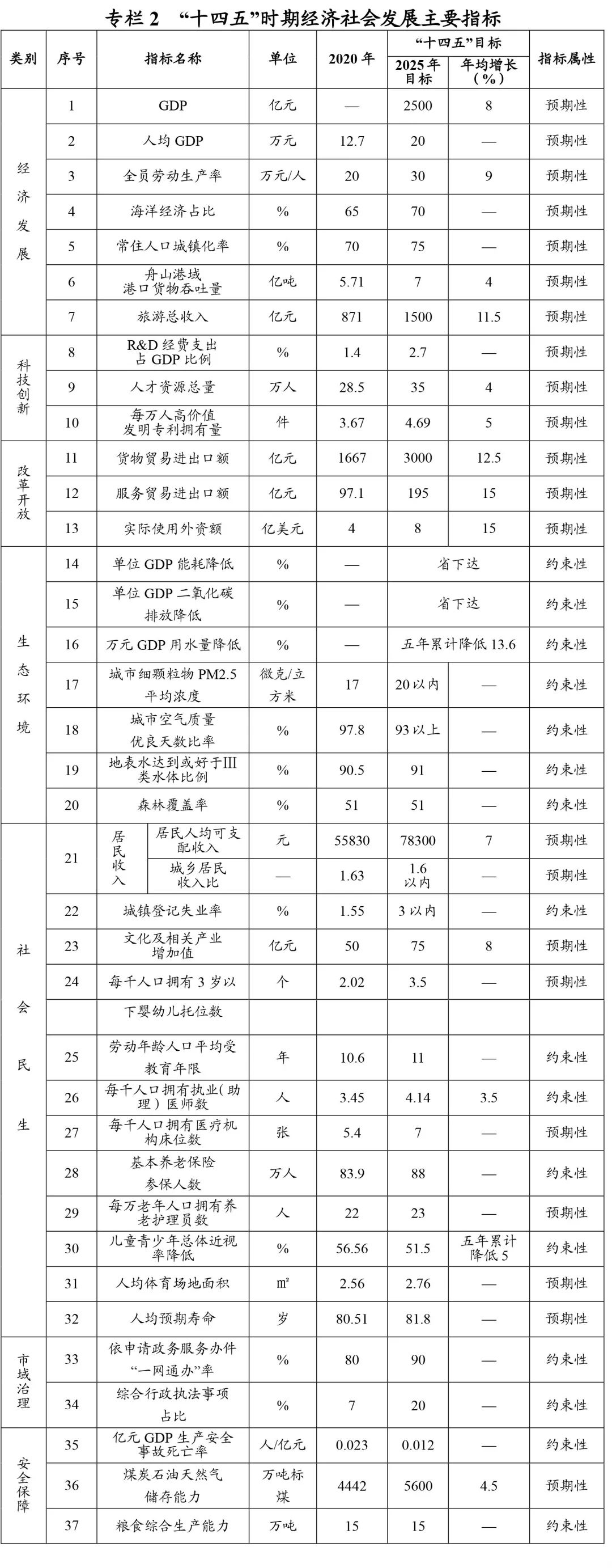 舟山市国民经济和社会发展第十四个五年规划和二〇三五年远景目标纲要