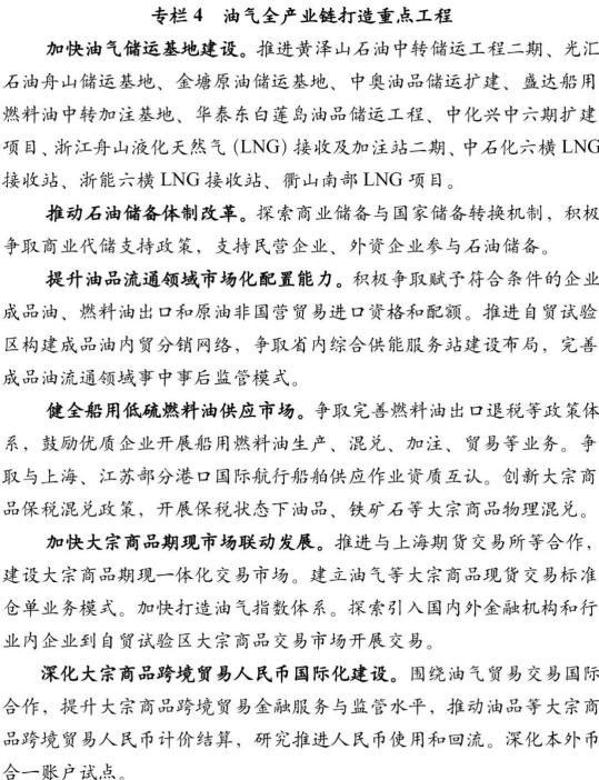 1.突出油气全产业链开放。实施物流设施提升、油气投资商集聚、政策攻坚突破等专项计划,成为全球油气全产业链的新兴力量。加快推进黄泽山、六横LNG接收站等重点油气储运项目,打造LNG登陆中心,完善油气储运设施和管网建设,推动石油储备体制改革,吸引石油富集国、大型贸易企业在自贸试验区储油,油品储存能力达到4000万立方米,天然气接卸能力达到1100万吨,油气年吞吐量超过1.4亿吨。加强与上海期货交易所合作,打造具有国际影响力的现货交易市场和区域能源贸易结算中心,以油气为主的大宗商品交易额突破2万亿元,实现油品贸易额8000亿元。加快国际海事服务基地建设,围绕船员、船东、船舶,做大做强东北亚船用燃料油供应中心,推进跨港跨关区供应业务,完善锚地等配套基础设施建设,推广“舟山船型”供油船技术规范,打造专业供油船队,加快布局和发展船用LNG加注业务,船用燃料油加注量突破1000万吨。培育具有国际竞争力的外轮供应市场,创新“先供后报”“分送集报”“一船多能”等便利化监管模式,实现综合海事服务常态化开展,进一步提升船舶物资供应、船员换班、检验检测等一站式服务能力,探索打造干散货租船交船中心,打造国际绿色修船基地,鼓励拓展航修服务,实现外轮供应货值60亿美元。加快大宗商品跨境贸易人民币国际化示范区建设,开展本外币合一账户试点,跨境人民币结算额突破1500亿元。