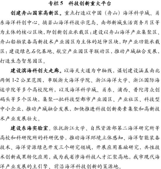 1.打造重大科技创新平台。创建国家级高新区,完善高新区创新创业政策,优化创新发展、招商引智、产业服务等软环境。积极谋划建设滨海科创大走廊,推动产城融合发展,加快推进科技创新要素集聚和高新技术产业发展壮大。支持浙江海洋大学、浙大海洋学院建设国内一流海洋类高校。加快建设东海实验室,争创智慧海洋领域浙江省实验室。推进国海舟山海洋科技研发基地、海洋地质调查与勘探服务基地等一批重点海洋院所建设,建设国家海洋技术海上公共试验场、国家级水产遗传育种及繁育基地、石油天然气储运技术工程实验室、绿色石化与新材料研究中心、新材料产业创新中心、企业研究院等产业创新载体。