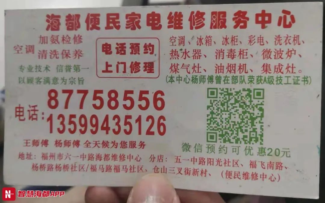 2月28日,家住福州鼓楼区的王依伯发现家门上插着一张小卡片,上面印着“海都便民家电维修服务中心”的字样。因为印有“海都”字样,他便按上面的电话预约了上门清洗抽油烟机。