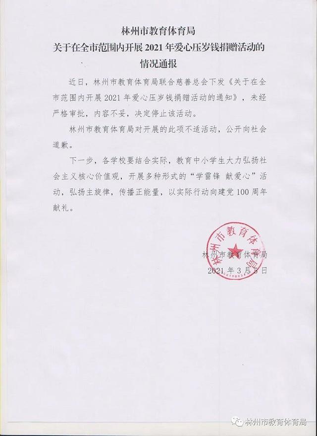 近日,河南林州市教体局一份关于在全市中小学、幼儿园中开展捐赠压岁钱活动的文件引发热议。对此,3月5日下午,林州市教育体育局微信公众号发布“号召学生捐压岁钱”活动情况通报。通报称,该通知未经严格审批,内容不妥,决定停止该活动。对开展的此项不适活动,公开向社会道歉。