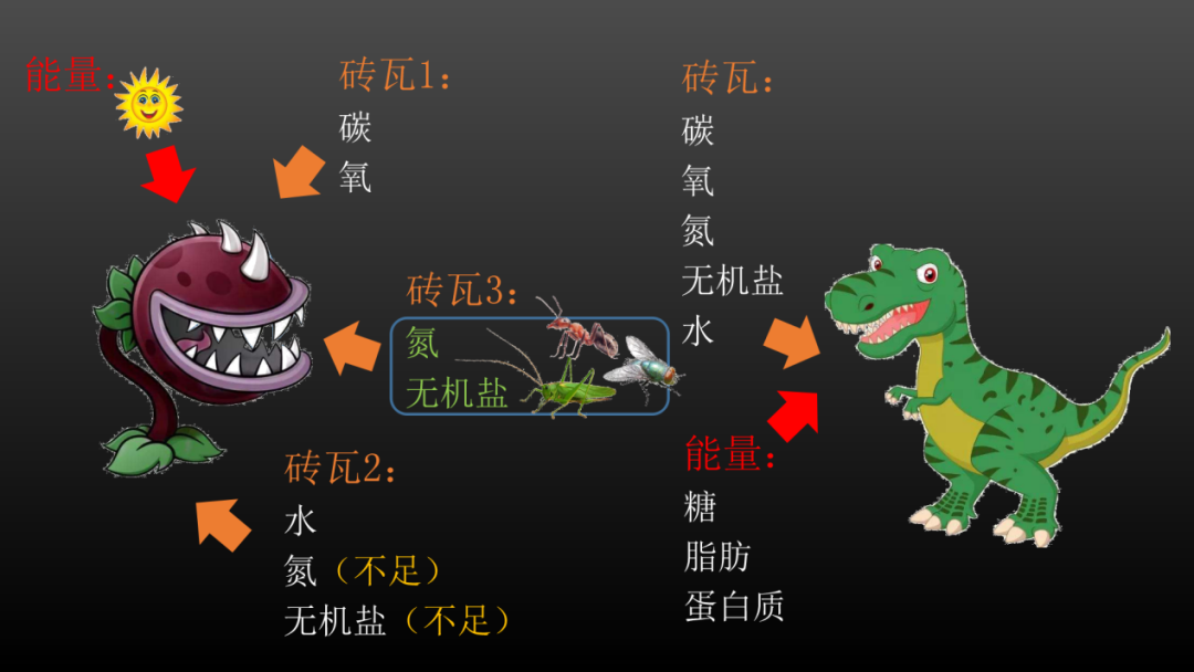 无论是动物还是植物,要生存都需要两大类补给,一是砖瓦(物质),二是能量。生物的生长就像盖房子,需要砖瓦和将砖瓦垒成房子所需的能量。砖瓦包括各类元素,例如碳、氢、氧、氮、硫、磷、钾、铁等,这些元素会相互组合在一起,形成水、蛋白质、脂肪、糖、维生素、二氧化碳和各类无机盐,所以很多情况下,生物是以吸收这些化合物的方式来获取砖瓦的。例如蛋白质和一些无机盐中含有大量的氮、磷、钾、硫等元素。同时,像脂肪、糖、蛋白质等化合物中也含有很多能量。因此对于动物来说,将这些东西吃进肚子里,砖瓦和能量就都得到了。