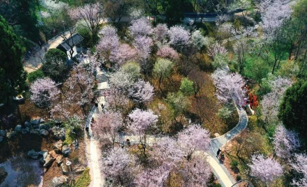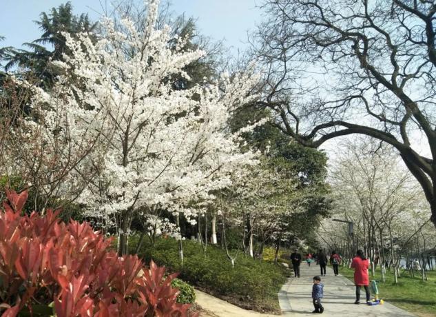 图/胡冬冬 摄公园内种植有1000多株樱花,其中“御衣黄”品种武汉少见。每到春季,樱花、玉兰、茶花、海棠、含笑等争相开放,各种花色参差错落、白粉相间。
