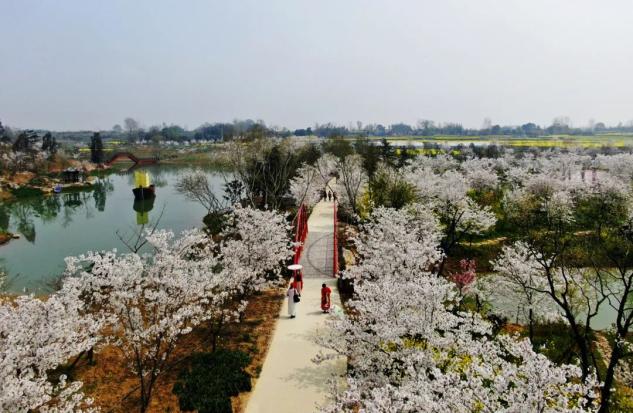 景区樱花主要位于田野开心农场西侧、北侧以及北湖环湖绿道沿线,品种为日本晚樱,种植面积约20亩、共3000余株。每到春季,田野乡村公园的樱花与周边郁金香、桃花、梅花、杏花、梨花、诸葛菜、迎春花竞相开放,各色花卉相映成趣,向游客展现出一幅五彩斑斓、春意盎然的美丽乡村画卷。花期:3月中旬至4月中下旬