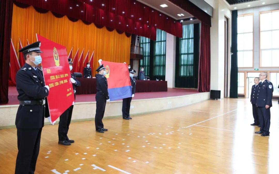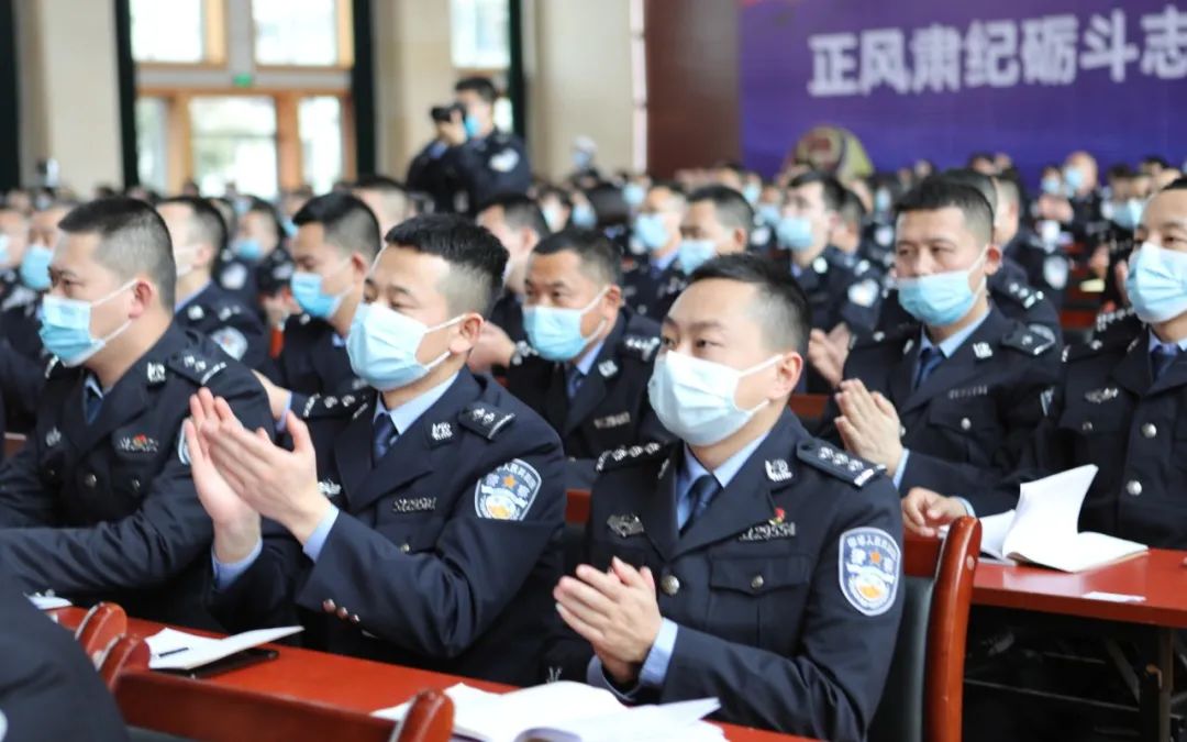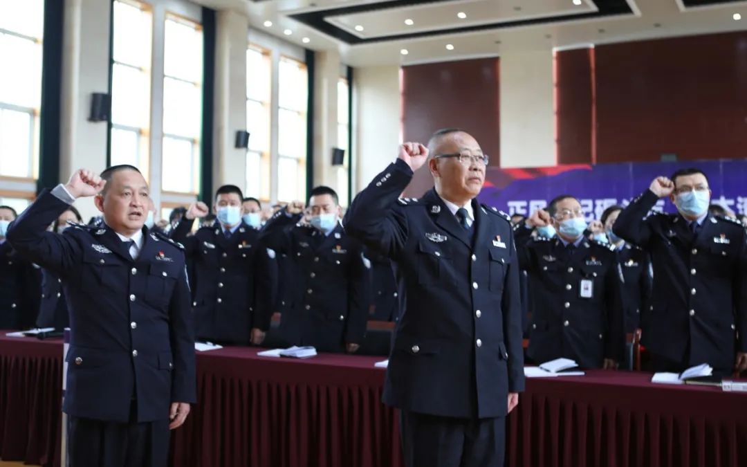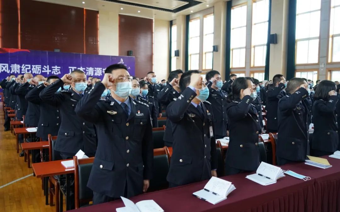 全体民警面向警旗宣誓会上,由省政法队伍教育整顿指导组,省厅、省局联系组监誓,党委书记、监狱长陈凉领誓,全体民警面向警旗,宣誓做到: