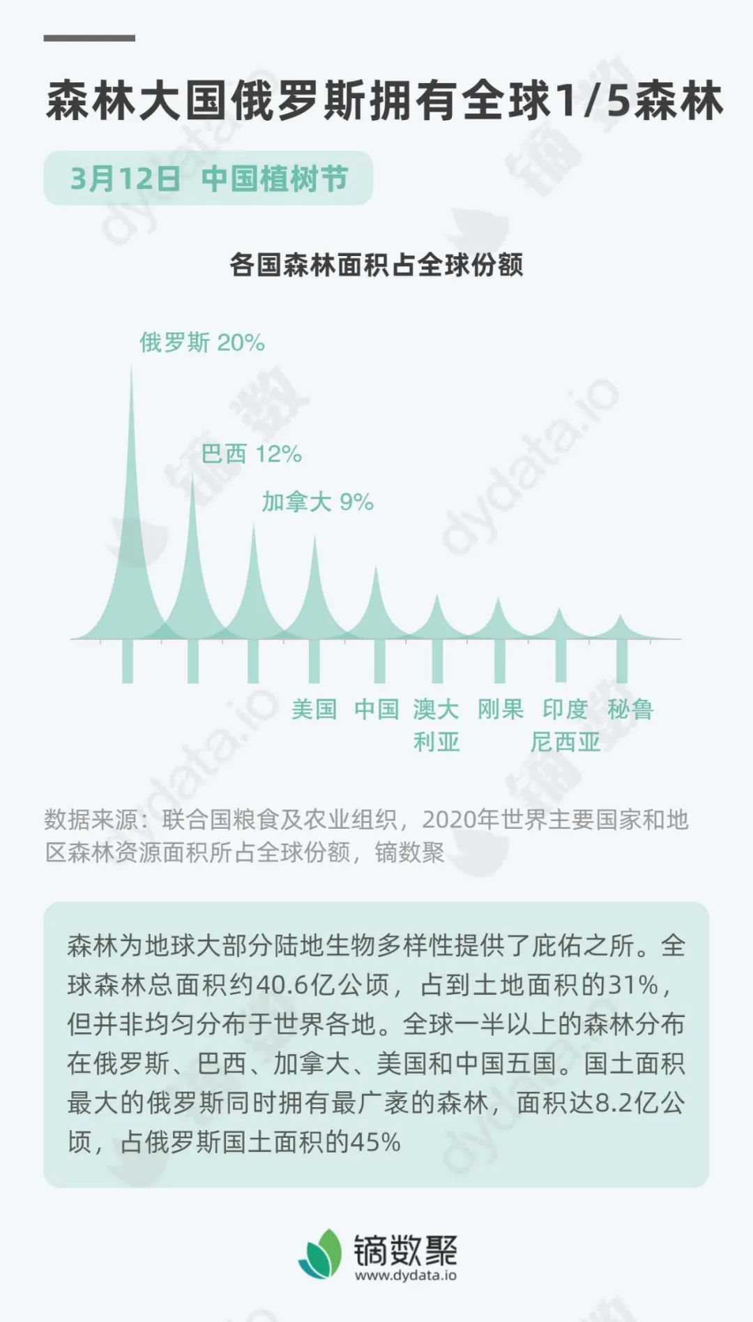 森林为地球大部分陆地生物多样性提供了庇佑之所。全球森林总面积约40.6亿公顷,占到土地面积的31%,但并非均匀分布于世界各地。全球一半以上的森林分布在俄罗斯、巴西、加拿大、美国和中国五国。国土面积最大的俄罗斯同时拥有最广袤的森林,面积达8.2亿公顷,占俄罗斯国土面积的45%。