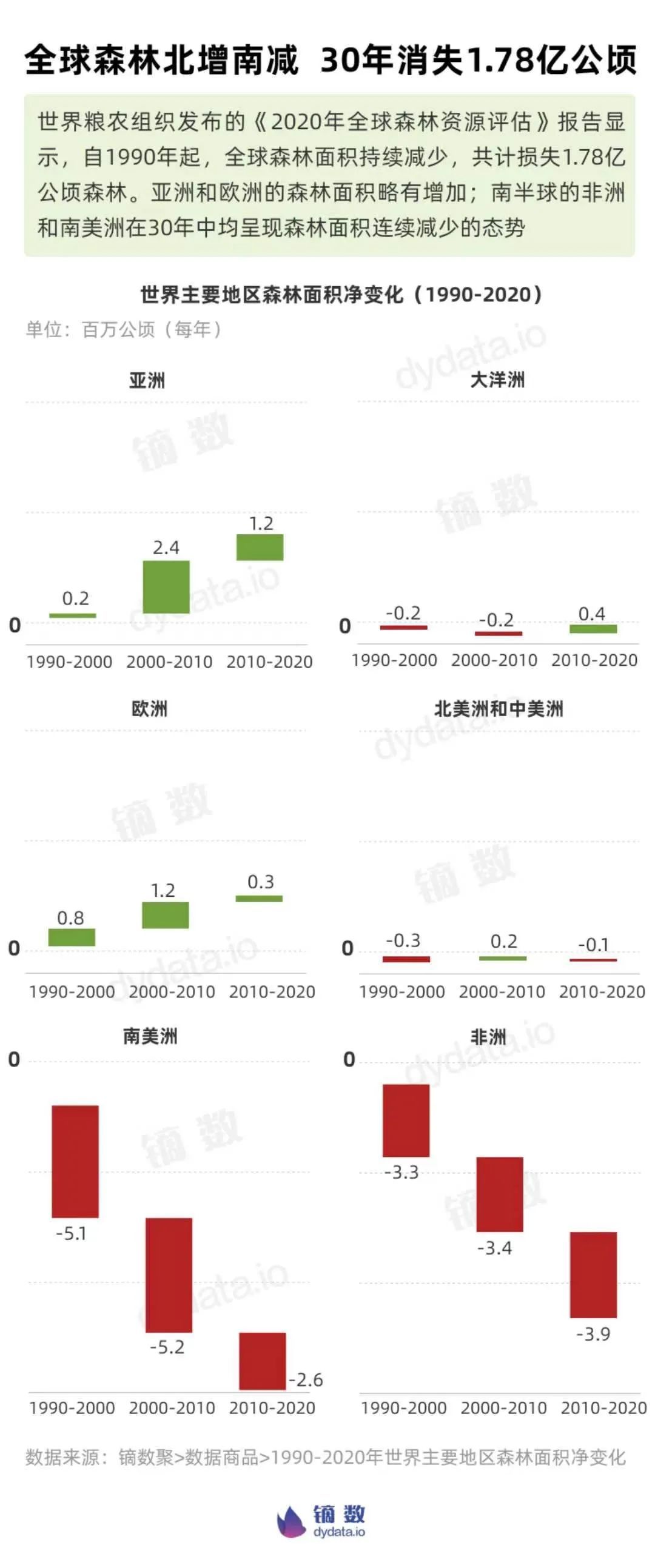 世界粮农组织发布的《2020年全球森林资源评估》报告显示,自1990年起,全球森林面积持续减少,共计损失1.78亿公顷森林。亚洲和欧洲的森林面积略有增加;南半球的非洲和南美洲在30年中均呈现森林面积连续减少的态势。