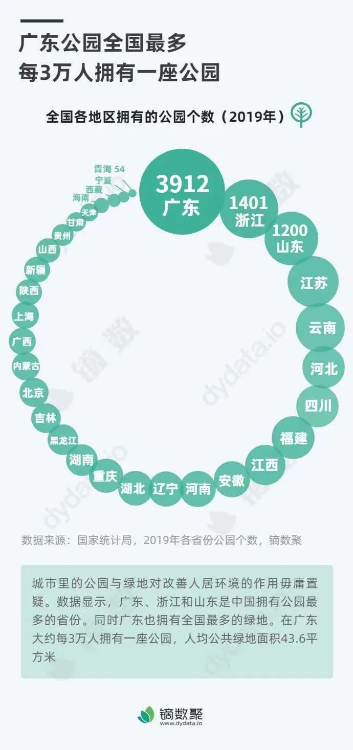 城市里的公园与绿地对改善人居环境的作用毋庸置疑。数据显示,广东、浙江和山东是中国拥有公园最多的省份。同时广东也拥有全国最多的绿地。在广东大约每3万人拥有一座公园,人均公共绿地面积43.6平方米。
