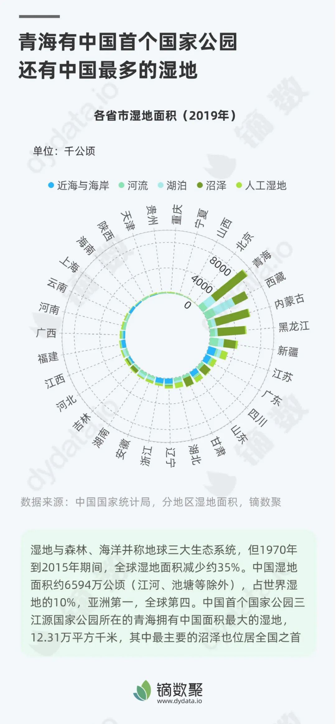 湿地与森林、海洋并称地球三大生态系统,但1970年到2015年期间,全球湿地面积减少约35%。中国湿地面积约6594万公顷(江河、池塘等除外),占世界湿地的10%,亚洲第一,全球第四。中国首个国家公园三江源国家公园所在的青海拥有中国面积最大的湿地,12.31万平方千米,其中最主要的沼泽也位居全国之首。