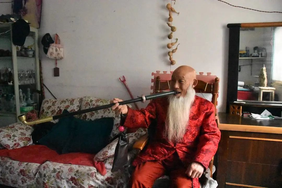 王庆云除了他的长胡子,还有两大标志:唐装和长烟杆大烟袋。它们和长胡子一样,已经成为他生活中不可分割的一部分,“有时候碰见熟人,看到我手里空着都会问,你的大烟袋怎么没拿?”