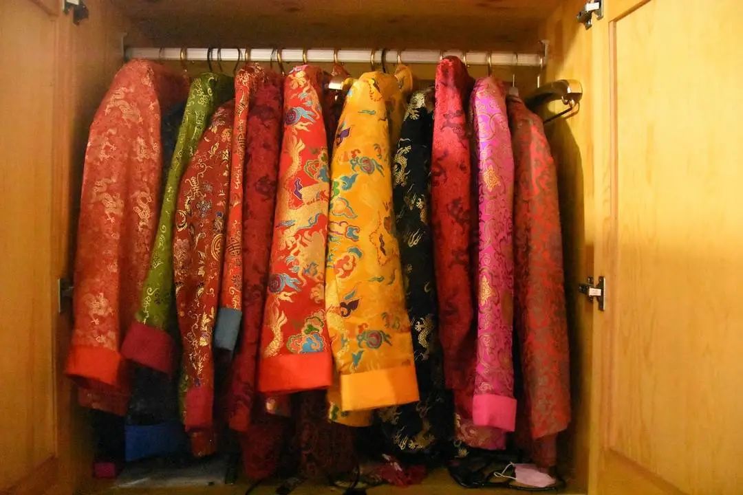 王庆云对唐装的热爱也不逊色。老两口的卧室里有一个衣柜,里面王庆云的衣服占了三分之二,其中用衣架挂着的全是唐装,各色各样,有近30套。