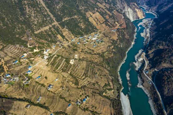 无人机拍摄的雅砻江畔四川省凉山彝族自治州冕宁县里庄镇全阁村。图|新华社