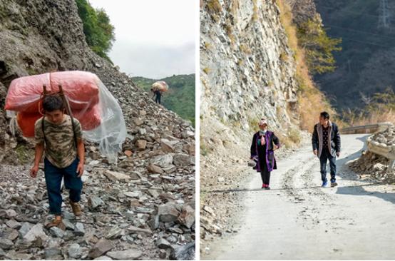 左图为2018年7月16日,村民走在硬化前的四川省凉山彝族自治州冕宁县里庄镇全阁村通村路上运输物资;右图为2021年1月13日,村民走在硬化后的全阁村通村路上。图| 新华社