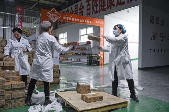 2020年11月11日,闽宁禾美电商扶贫车间的女员工在传递货物,准备装车发货。图|新华社