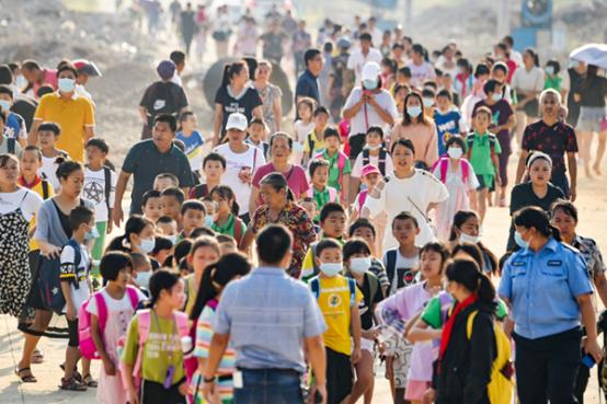 2020年8月31日,贵州省铜仁市松桃苗族自治县易地扶贫搬迁团山安置点,搬迁群众送子女去上学。图|新华社