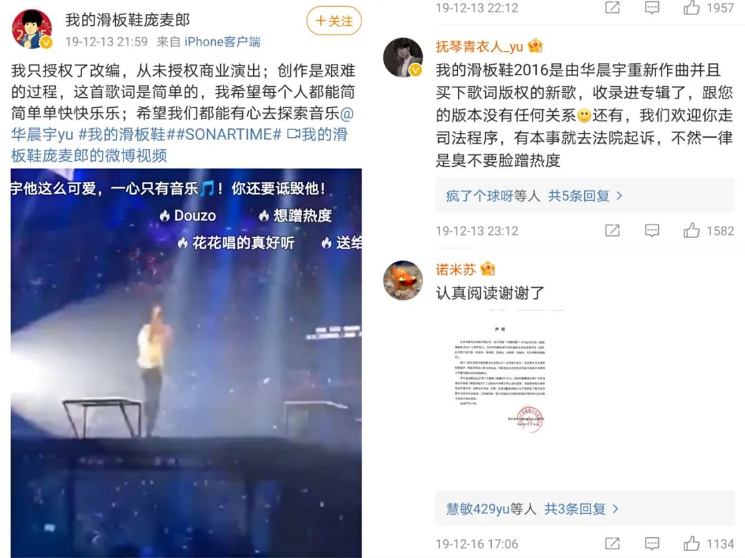 2019年12月13日,庞麦郎微博@华晨宇未经授权将《我的滑板鞋》带到商业演出,部分华晨宇的粉丝则认为华晨宇已经买了版权,是庞麦郎在故意炒作蹭热度。而华晨宇方也出了相关的声明以自证清白。