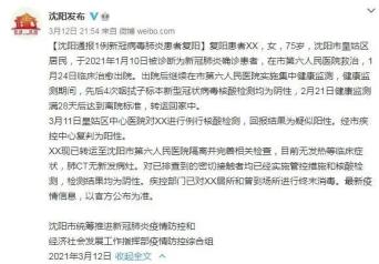 ▲12日,辽宁沈阳通报1例本土新冠肺炎患者复阳。目前,这名复阳患者现有排查的密接者和密接的密接者、同单元楼栋的居民核酸检测结果均为阴性。患者家中、所在单元电梯、楼道等环境核酸采样检测结果也均为阴性。