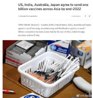 天下博览▲据路透社新德里消息,印度外交秘书当地时间12日说,美国、印度、澳大利亚和日本领导人同意在2022年底前整合资金、制造和分销能力,在亚洲各地提供10亿剂新冠病毒疫苗。报道称,由4个国家组成的所谓“四国联盟”希望扩大全球疫苗接种规模,并抗衡中国在东南亚和世界各地日益增长的影响力。四方虚拟峰会结束后,印度外交秘书哈什·瓦尔丹·什林拉在印度首都新德里举行的记者招待会上说,这次合作“是最紧迫和最有价值的”。