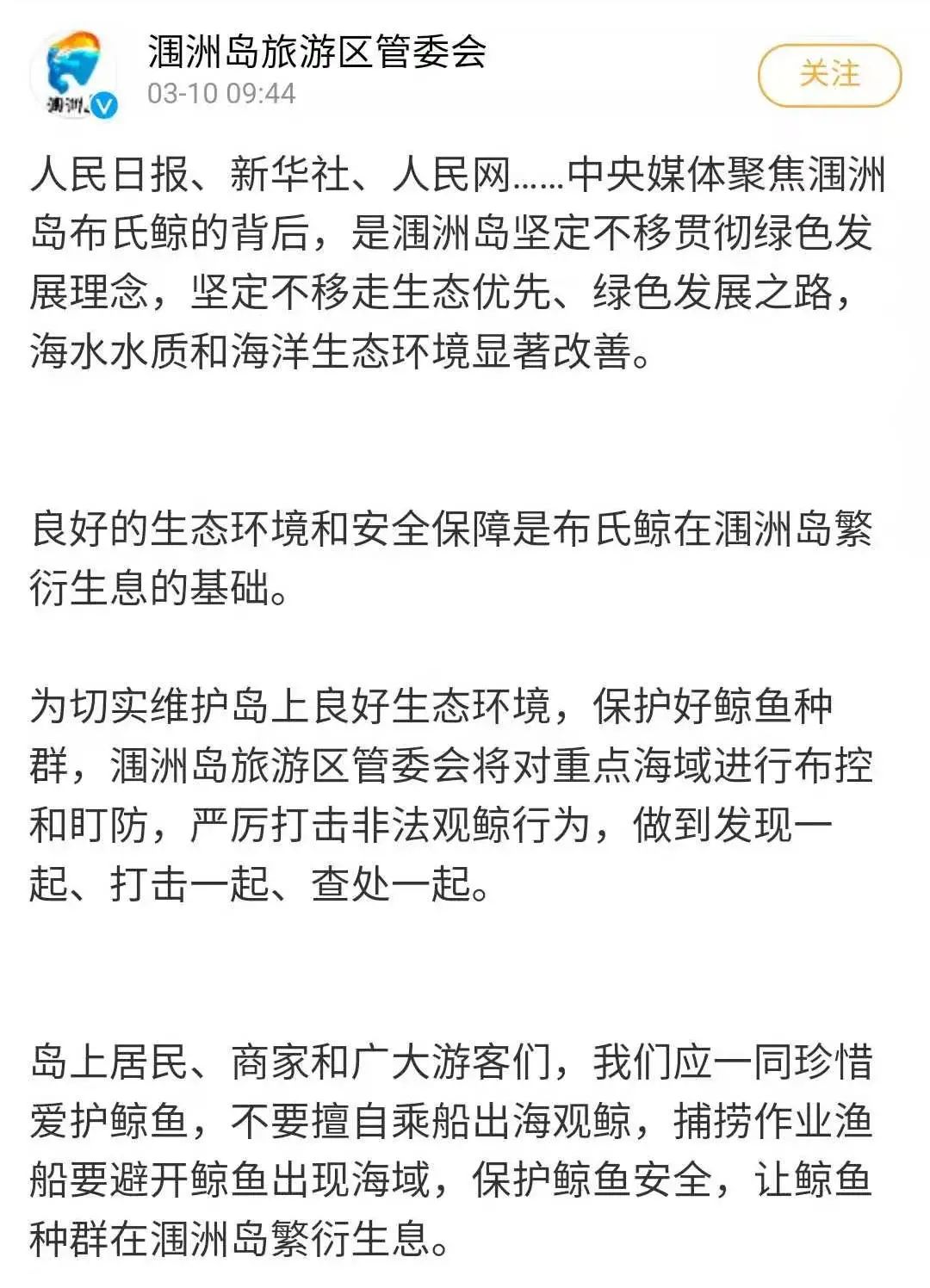 涠洲岛旅游区管委会发布声明 | 新浪微博科学的观鲸活动应该在不干扰鲸类正常活动的情况下进行,期间游人既可以体验到自然状态下鲸类的美,也可学习到相关的自然教育知识。在传统海洋馆缺乏海洋动物福利保障的背景下,观鲸活动的这些优势显得格外可贵。