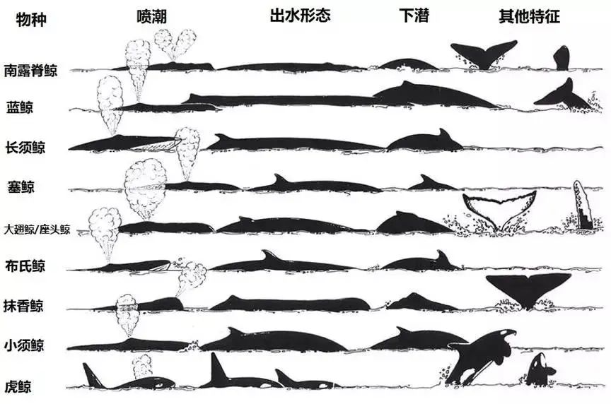 心形的喷潮 | wikipedia除了辨识喷潮,我们也可以从鲸类的体型大小、出水形态、分布区域等特征判断它们的种类。大部分鲸类在即将潜水,尤其是深潜之前,会高高竖起自己的尾巴。不同鲸类的尾巴形状各不相同,这也是判断鲸类物种的依据之一。