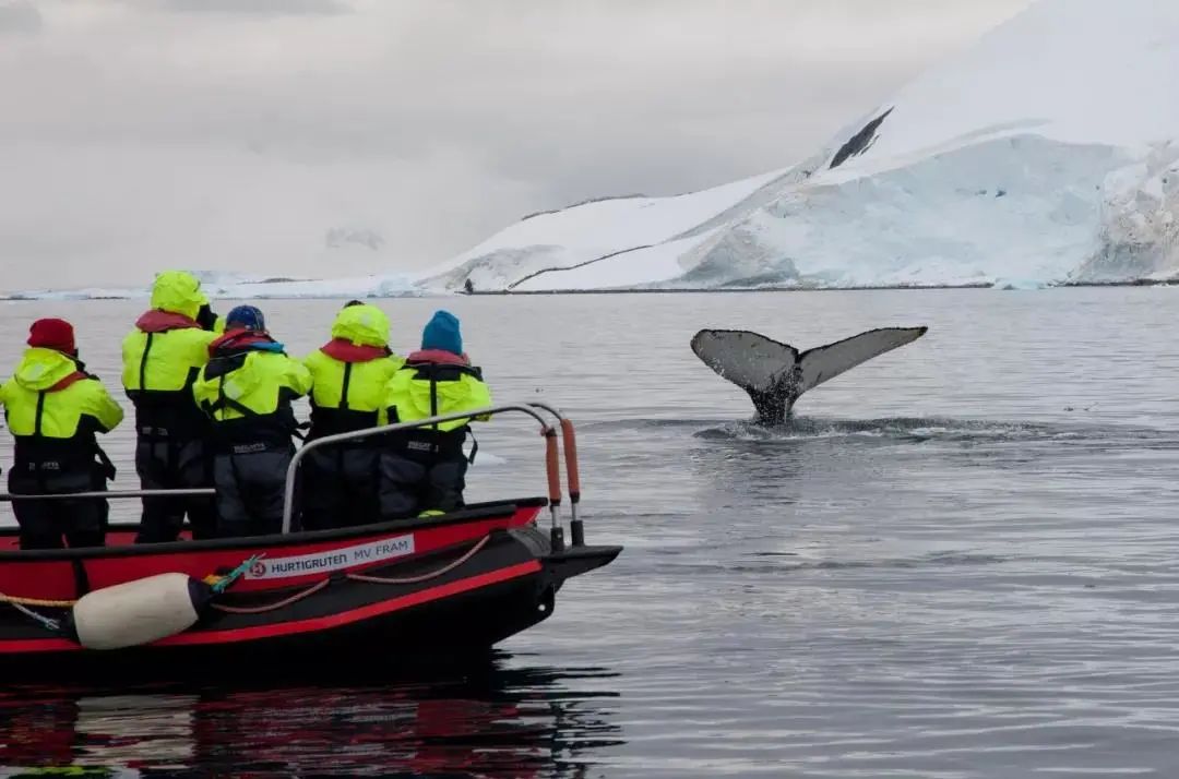 在南极,人们乘坐小艇排队观察大翅鲸。摄影师所在的小艇在后方,需等前方的小艇驶离后才可上前观察 | Corinna Gamma / Hurtigruten倾听讲解