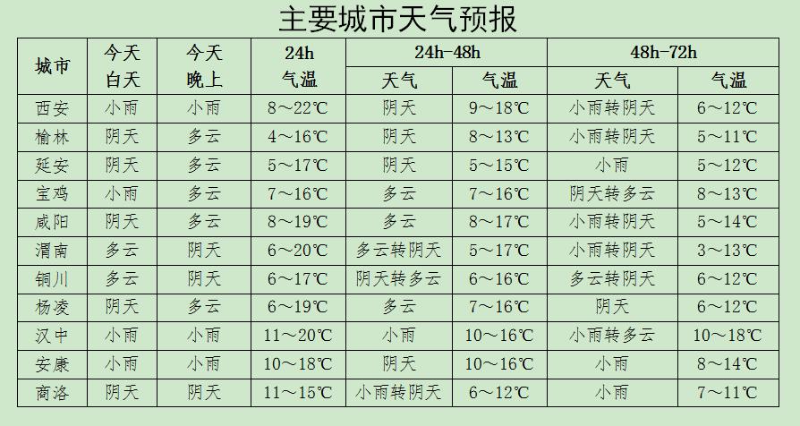 17日:全省阴天,陕北部分地方有小雨或阵雨,关中南部、陕南有小雨。18日:全省阴天有小雨,陕南东部部分地方有中雨。