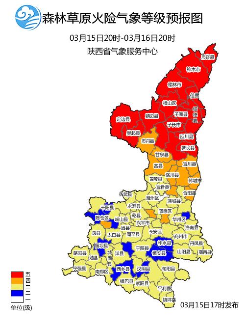 今日榆林和延安北部地区森林火险气象等级为5级(极度危险),志丹、甘泉、宜川、富县、洛川、黄龙、秦都、泾阳、临潼、韩城、合阳、白水等地为4级(高度危险),我省其他地区大部为2~3级(中度~较高危险),注意防范。