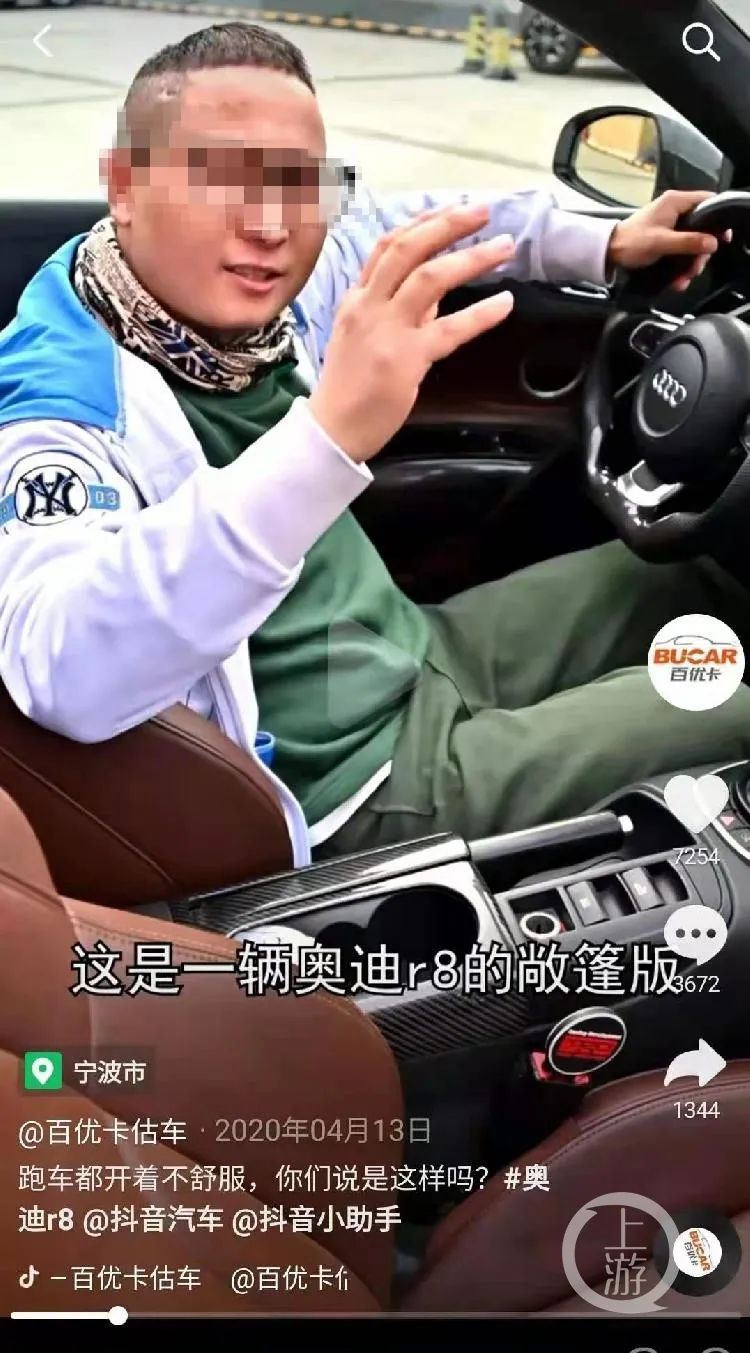 2020年4月,“大鲜”在抖音账号“百优卡估车”发布一辆白色奥迪R8评测视频。/视频截图1 网红:拍视频低价卖豪车,实际在玩“套路”