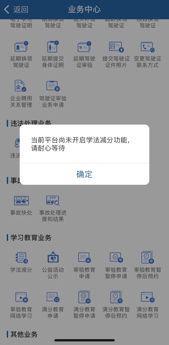 △记者在“交警12123”APP上点击“学法减分”功能,但系统提示“当前平台尚未开启学法减分功能,请耐心等待”。记者注意到,公安部交通管理局“接受教育减免交通违法记分”改革目前已在或将要在甘肃、广东、浙江等部分地区试行。2020年1月,公安部出台《接受交通安全教育减免交通违法记分工作规范(试行)》,实施“学法减分”政策,机动车驾驶人可通过参加网上学习考试、现场学习考试、交通安全公益活动三种途径减分。其中,“学法减分”的学习课程由省级公安交管部门设置,涵盖安全行车常识、紧急避险常识、交通违法行为判断等12个方面的内容;考试题库以全国统一题库为主体,各地自主题库为补充,每次考试随机抽取20题,答对18道题及以上为合格。在接受交通安全教育后,机动车驾驶人符合减免记分条件的,在其现有累积记分分值中扣减,每个记分周期内通过“学法减分”可累计最高减免6分。