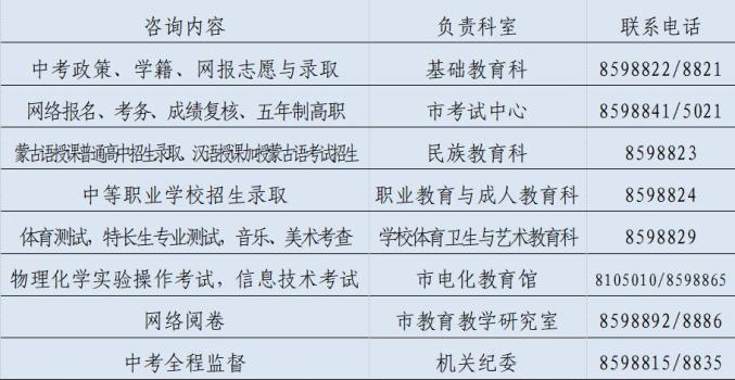 (三)咨询服务制度。为方便考生、家长和社会了解、参与、监督中考工作,建立咨询服务制度。咨询内容、负责科室及联系电话如下: